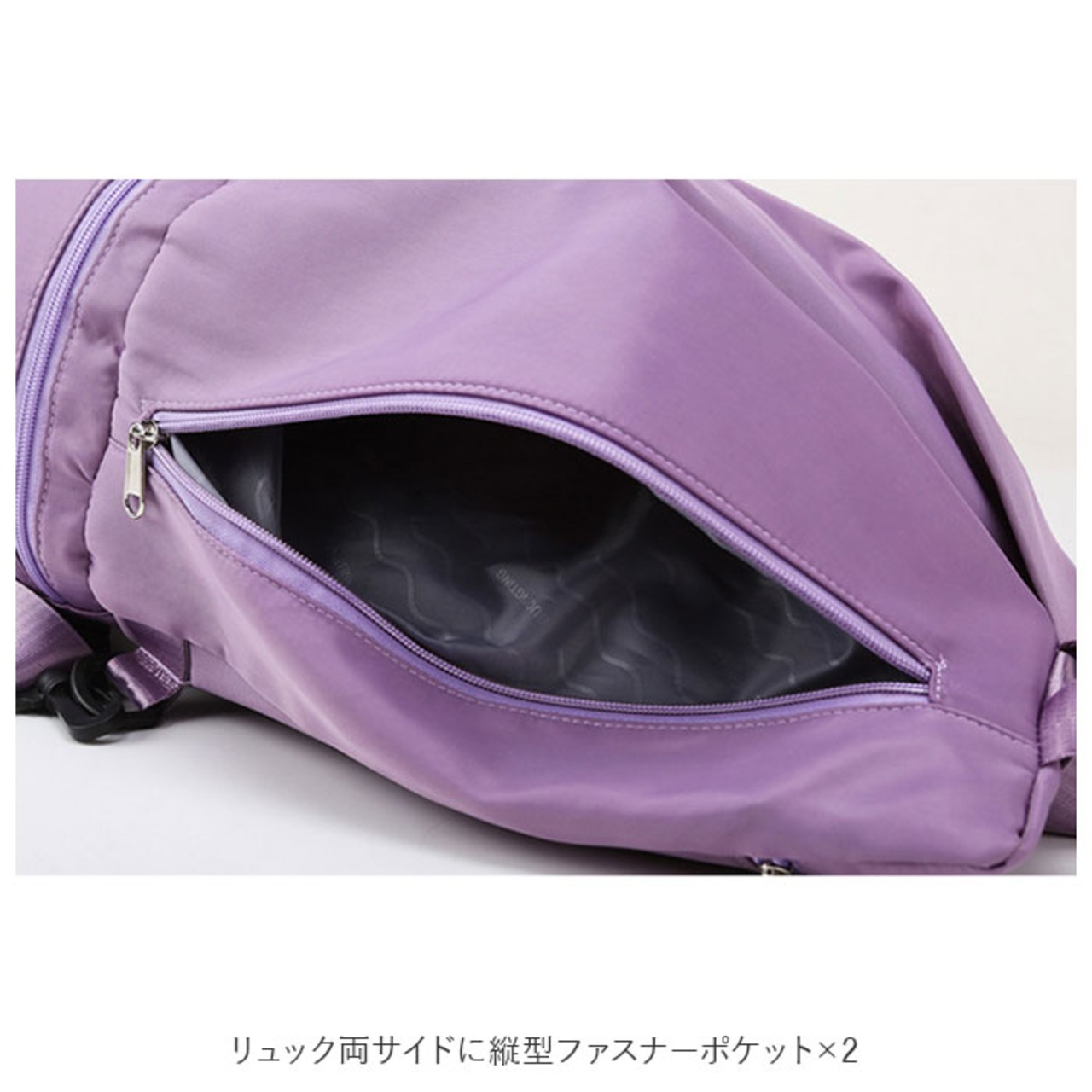 ・リュック両サイドの縦型ファスナーポケット×2には、スマホにお財布、ウォーターボトルやフェイスタオルなどを入れるのに便利!