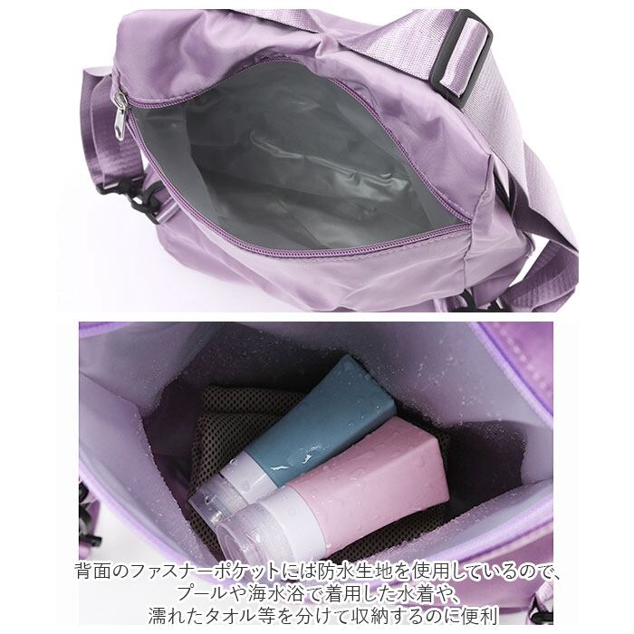 ・背面のファスナーポケットには防水生地を使用しているので、プールや海水浴で着用した水着や、濡れたタオル等を分けて収納するのに便利。