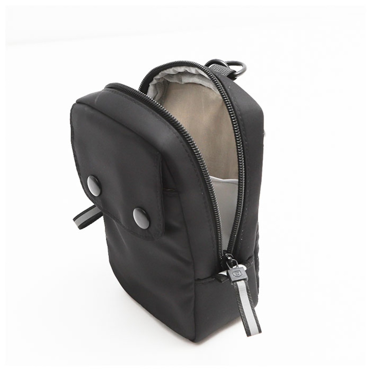 ・前面には、定期や小物類などを入れておけるフラップポケット付き。2つのスナップボタンでセキュリティもバッチリ。