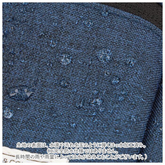 ・アウトドアや突然の雨でも慌てない!生地の表面は、水滴や汚れを玉のように弾くはっ水加工済み。(※完全防水仕様ではありません。長時間の雨や雨量によっては水が染みこむことがございます。)
