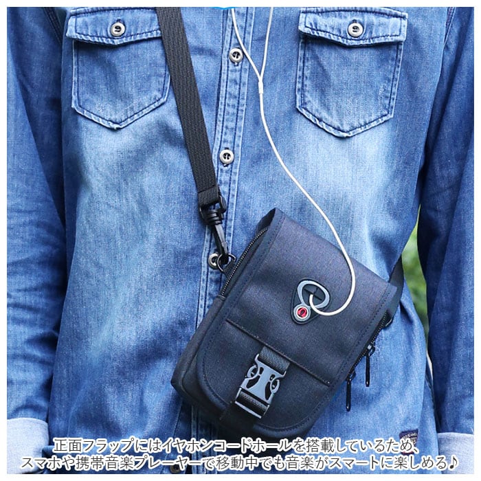 ・正面フラップにはイヤホンコードホールを搭載しているため、スマホや携帯音楽プレーヤーで移動中でも音楽がスマートに楽しめる♪
