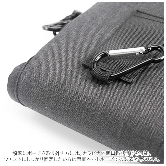 ・ウエストにしっかり固定したい方は背面ベルトループでの装着がオススメ。また、頻繁にポーチを取り外す方には、カラビナで簡単取り付けも可能。