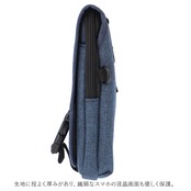・背面側のオープンタイプのメインルームはスマートフォンの定位置に。ポーチの生地に程よく厚みがあるため、繊細なスマホの液晶画面も優しく保護。