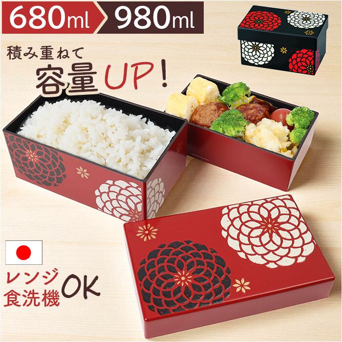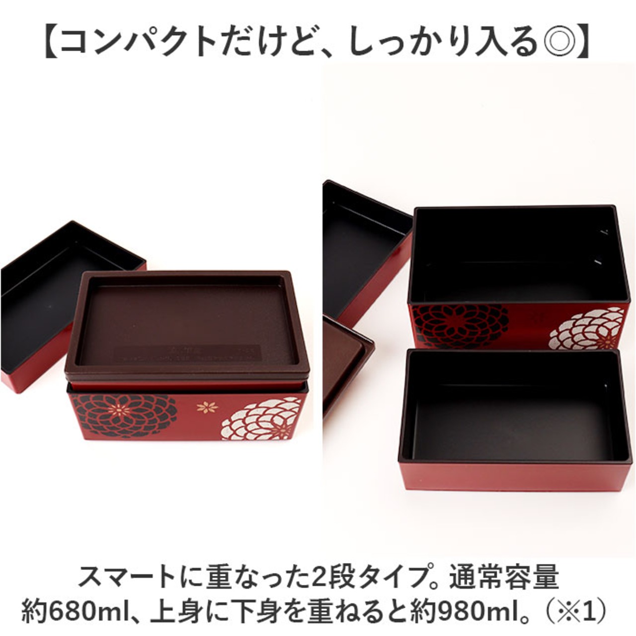 ・スマートに重なった2段タイプ。通常容量約680ml、上身に下身を重ねると約980ml。