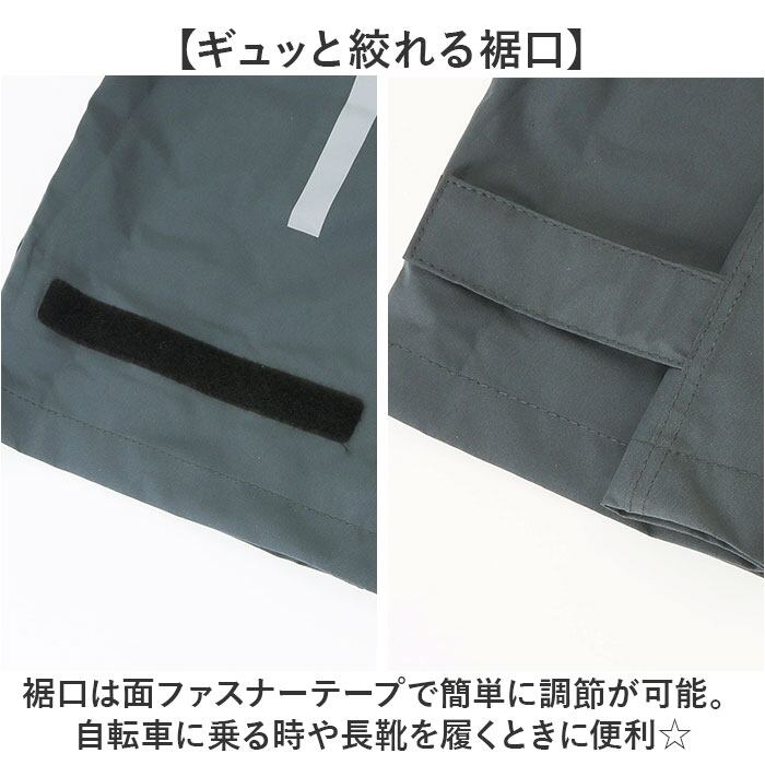 ・裾口は面ファスナーテープで簡単に調節が可能。自転車に乗る時や長靴を履くときに便利☆