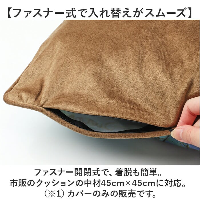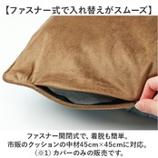 ・ファスナー開閉式で、着脱も簡単。市販のクッションの中材45cm×45cmに対応。