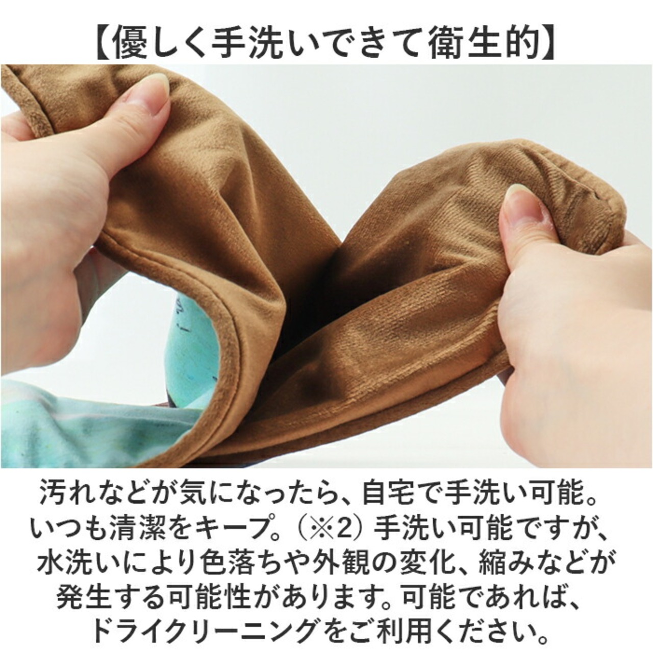 (※2)手洗い可能ですが、水洗いにより色落ちや外観の変化、縮みなどが発生する可能性があります。可能であれば、ドライクリーニングをご利用ください。