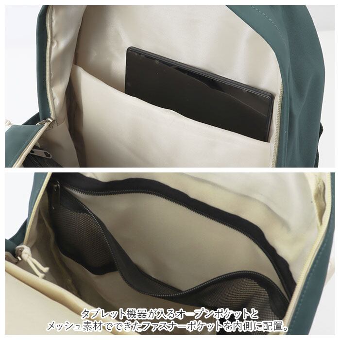 ・タブレット機器が入るオープンポケットとメッシュ素材でできたファスナーポケットを内側に配置。