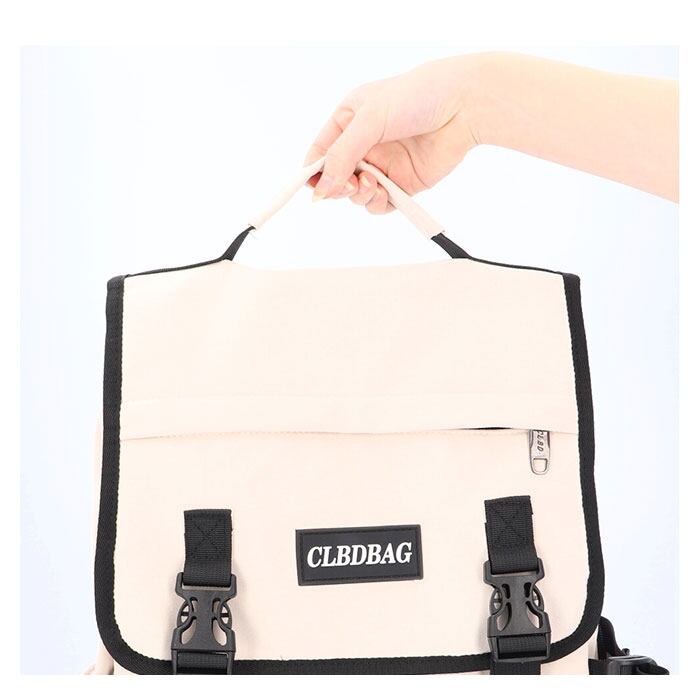 ・両サイドに横マチを固定できる、バックルベルト付き。荷物の量に合わせて調節可能。