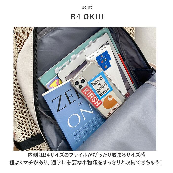 ・内側はB4サイズのファイルがぴったり収まるサイズ感。程よくマチがあり、通学に必要な小物類をすっきりと収納できちゃう!