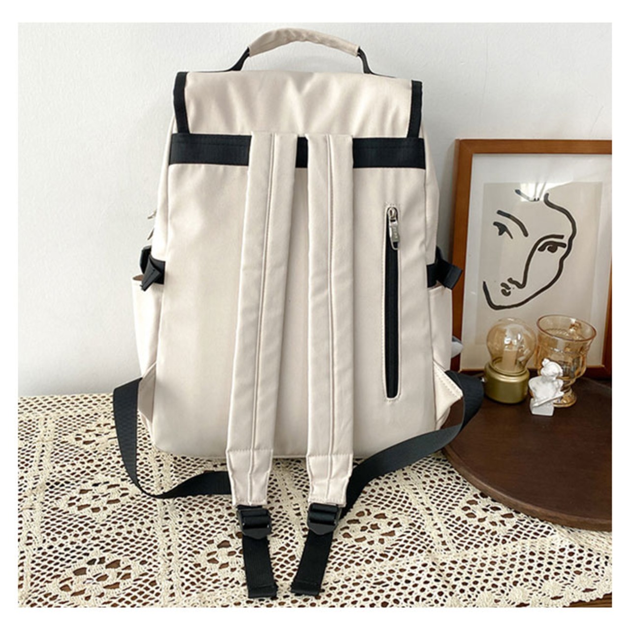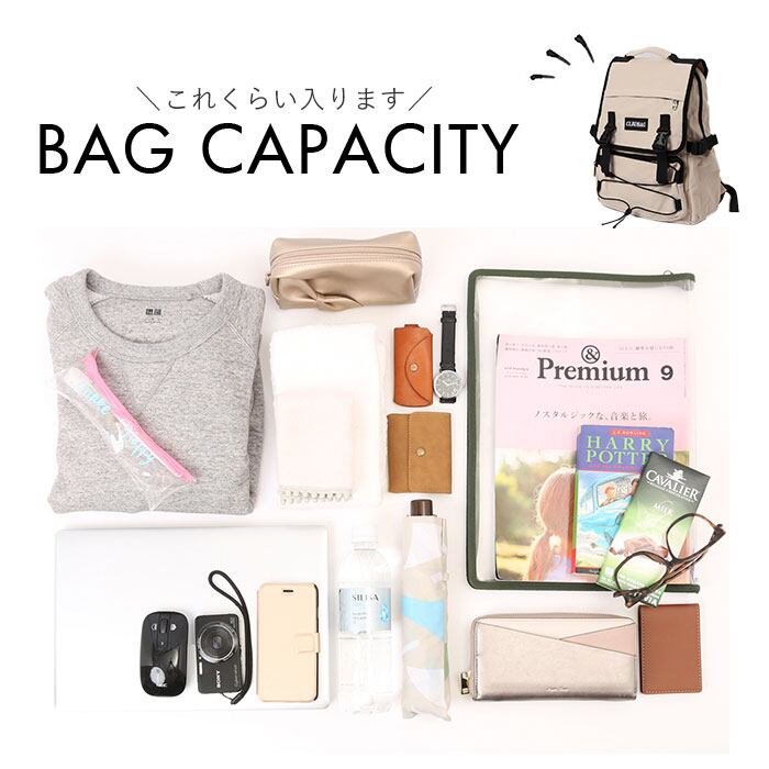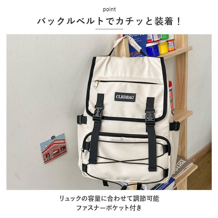 ・フロントのフラップはバックルベルトでカチッと装着!ベルトはリュックの容量に合わせて調節可能。