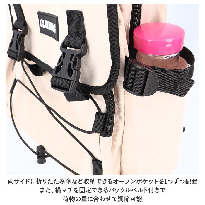 ・両サイドに、ペットボトルや折りたたみ傘を収納できるオープンポケットを1つずつ配置。