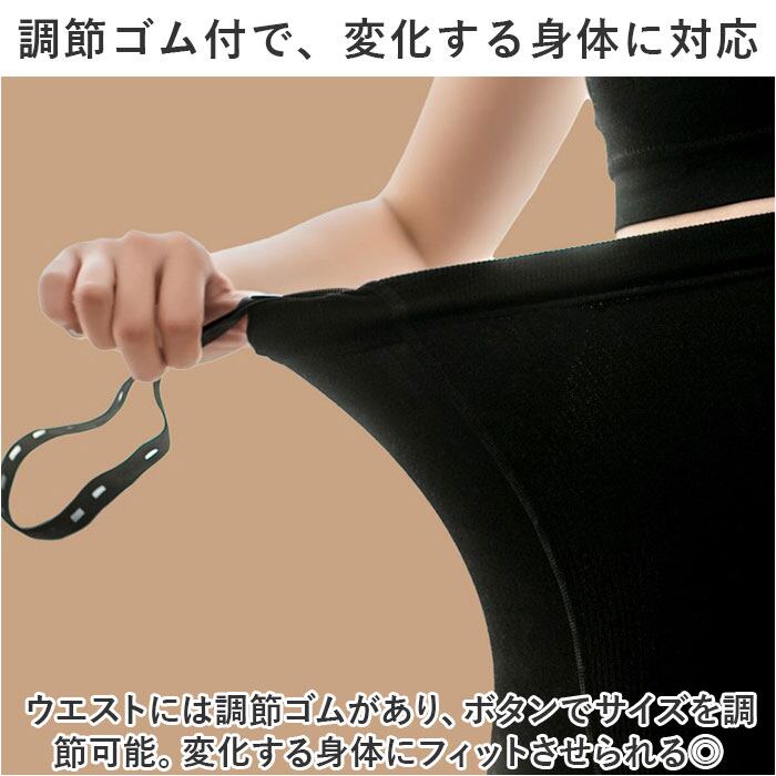 ・ウエストには調節ゴムがあり、ボタンでサイズを調節可能。変化する身体にフィットさせられる◎