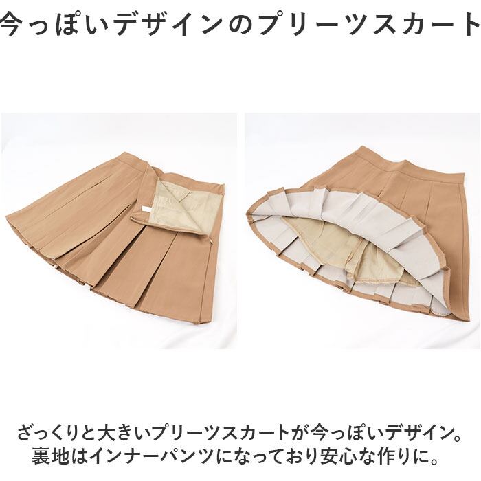 ・ざっくりと大きいプリーツスカートが今っぽいデザイン。裏地はインナーパンツになっており安心な作りに。
