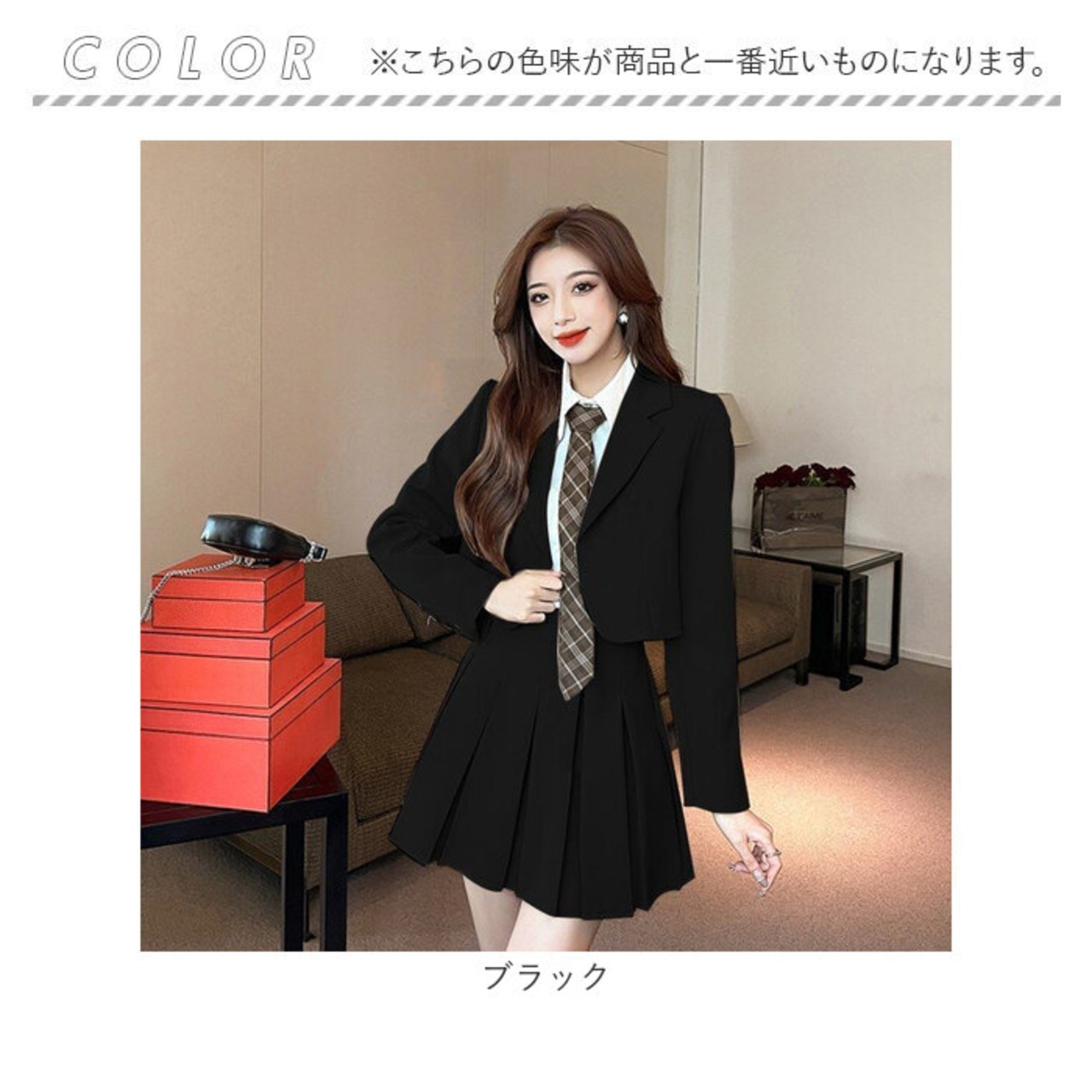 1つのセットでワンコーデが完了!ブラウス、ジャケット、スカートはもちろん、ネクタイが付いたセットアップ。あっという間にコーデが完成。