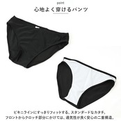 ・ビキニラインにすっきりフィットする、スタンダードなカタチ。フロントからクロッチ部分にかけては、通気性が良く安心の二重構造。