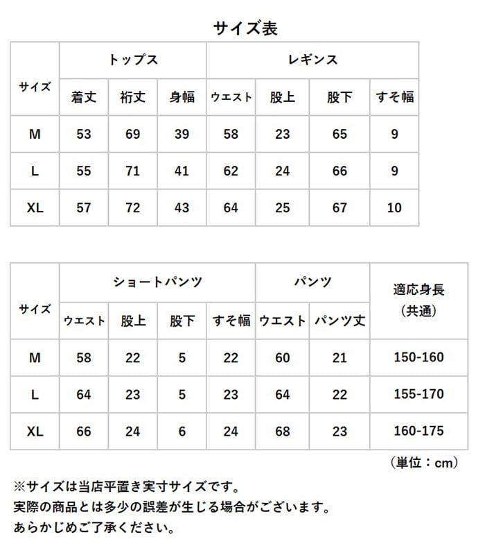 ・トップス・パンツ・レギンス・ショートパンツの4点セット。お好みに合わせて組み合わせをチェンジできて、気になる部分も程よくカバー。