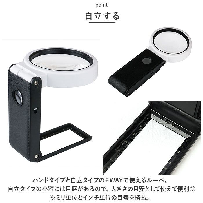 ・ハンドタイプと自立タイプの2WAYで使えるルーペ。自立タイプの小窓には目盛があるので、大きさの目安として使えて便利◎