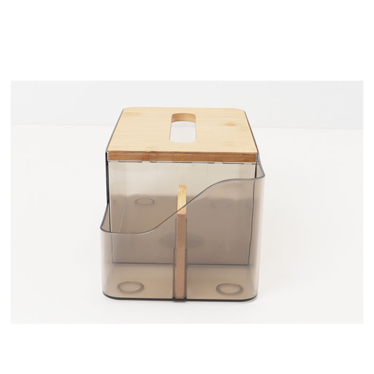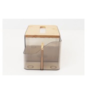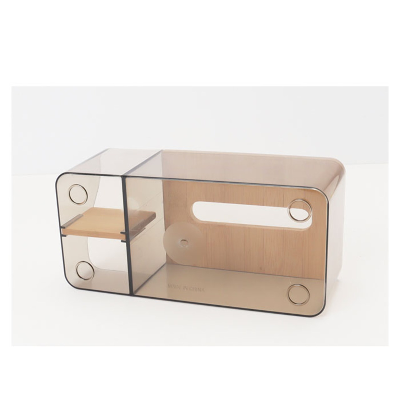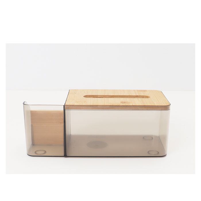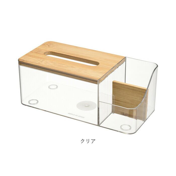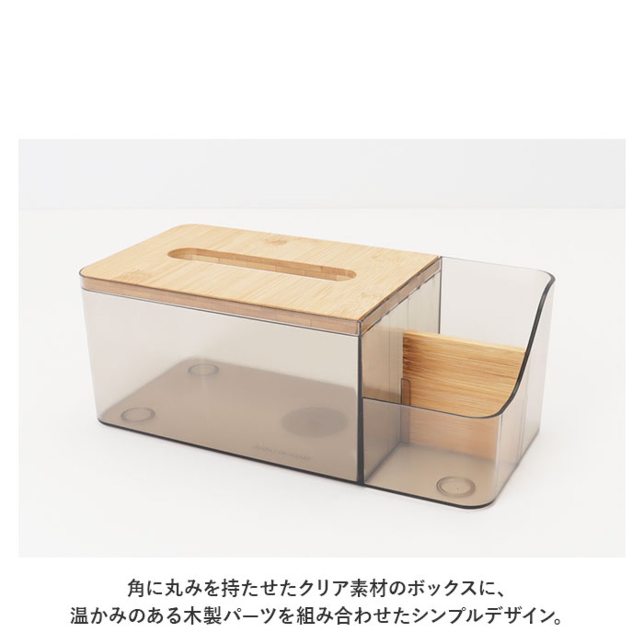 ・角に丸みを持たせたクリア素材のボックスに、温かみのある木製パーツを組み合わせたシンプルデザイン。