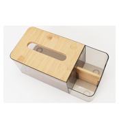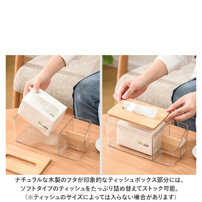 ・ナチュラルな木製のフタが印象的なティッシュボックス部分には、ソフトタイプのティッシュをたっぷり詰め替えてストック可能。(※ティッシュのサイズによっては入らない場合があります。紙箱タイプのティッシュではなく、ソフトパックタイプのティッシュを詰め替えてご使用ください。)