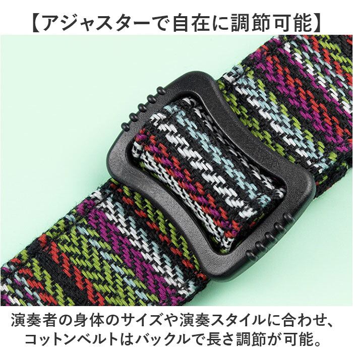 ・演奏者の身体のサイズや演奏スタイルに合わせ、コットンベルトはバックルで長さ調節が可能。