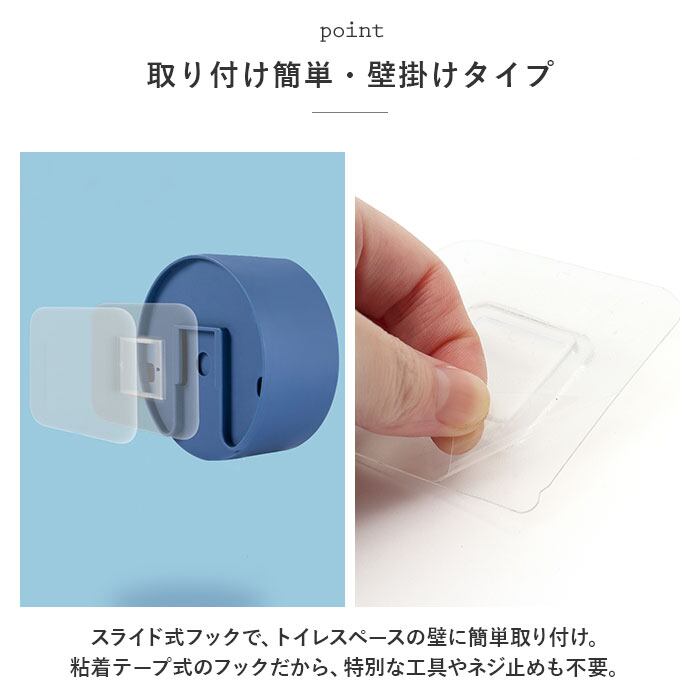 ・スライド式フックで、トイレスペースの壁に簡単取り付け。粘着テープ式のフックだから、特別な工具やネジ止めも不要。