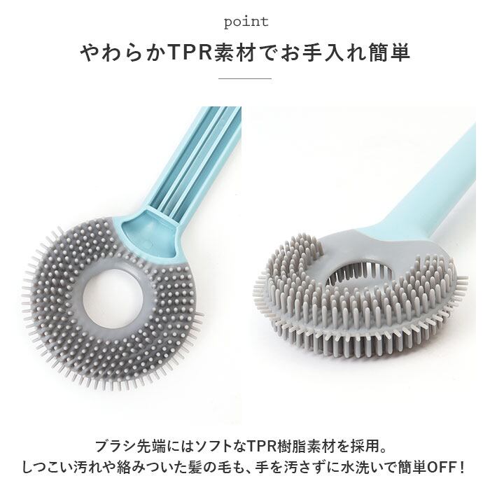 ・ブラシ先端にはソフトなTPR樹脂素材を採用。しつこい汚れや絡みついた髪の毛も、手を汚さずに水洗いで簡単OFF!