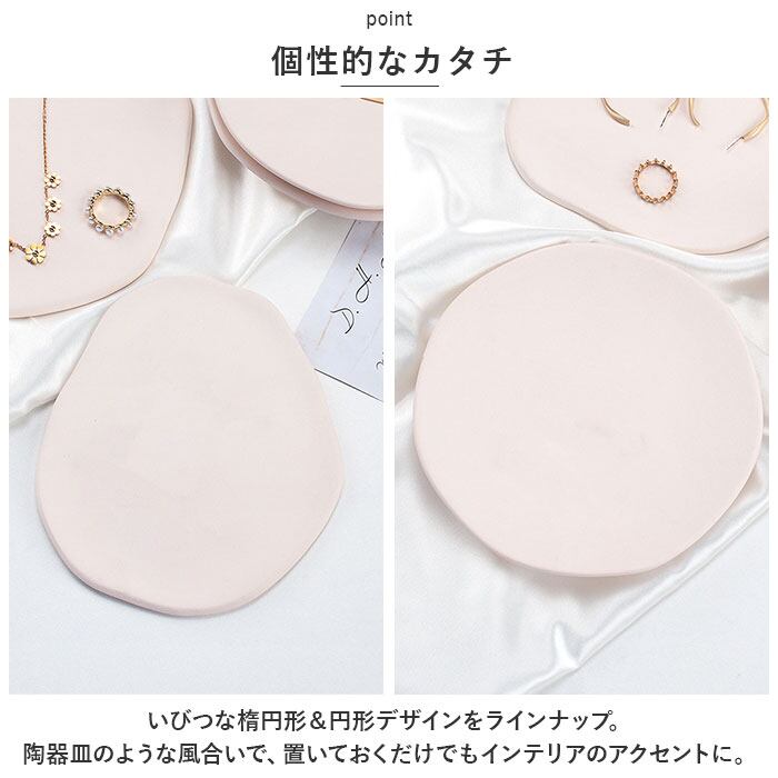 ・いびつな楕円形&円形デザインをラインナップ。陶器皿のような風合いで、置いておくだけでもインテリアのアクセントに。
