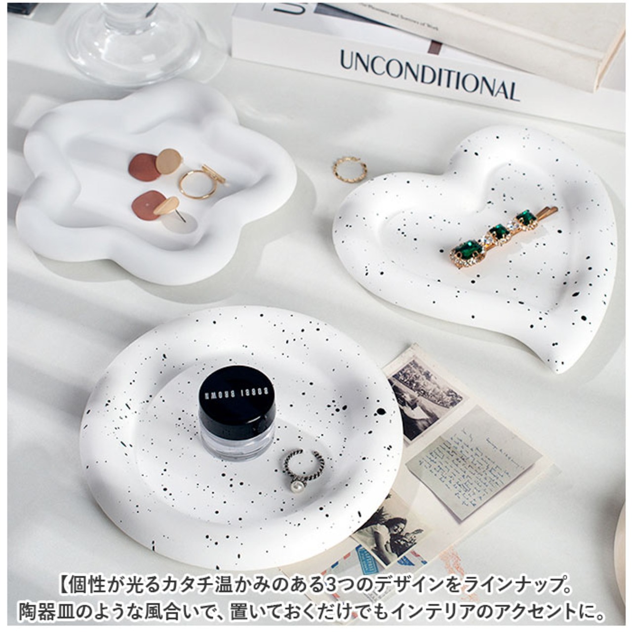 ・温かみのある3つのデザインをラインナップ。陶器皿のような風合いで、置いておくだけでもインテリアのアクセントに。