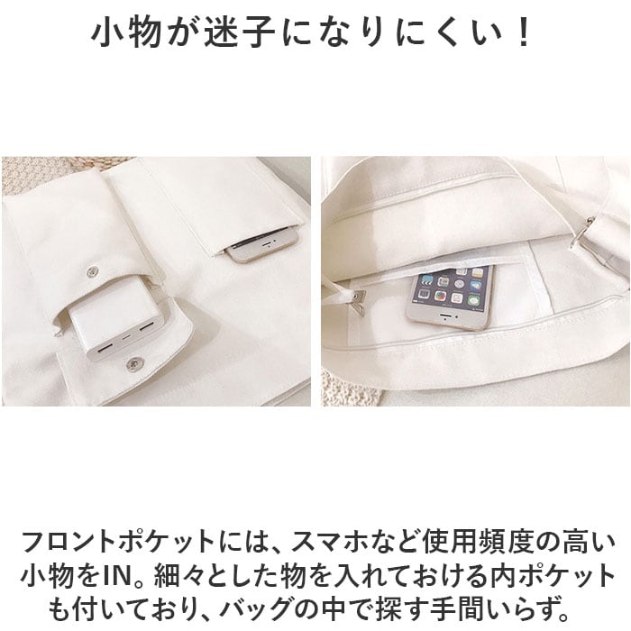 ・フロントポケットには、スマホなど使用頻度の高い小物をIN。細々とした物を入れておける内ポケットも付いており、バッグの中で探す手間いらず。