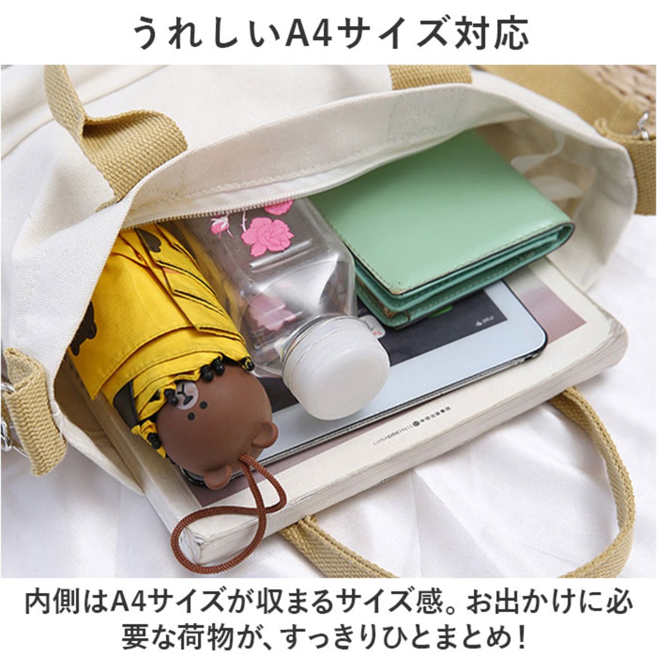 ・内側はA4サイズが収まるサイズ感。お出かけに必要な荷物が、すっきりひとまとめ!