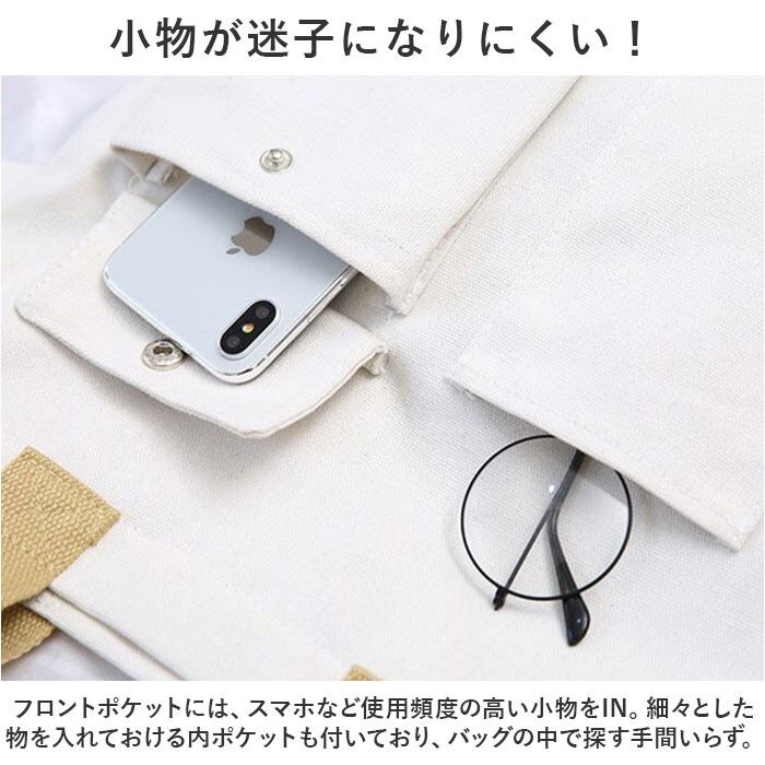 ・フロントポケットには、スマホなど使用頻度の高い小物をIN。細々とした物を入れておける内ポケットも付いており、バッグの中で探す手間いらず。