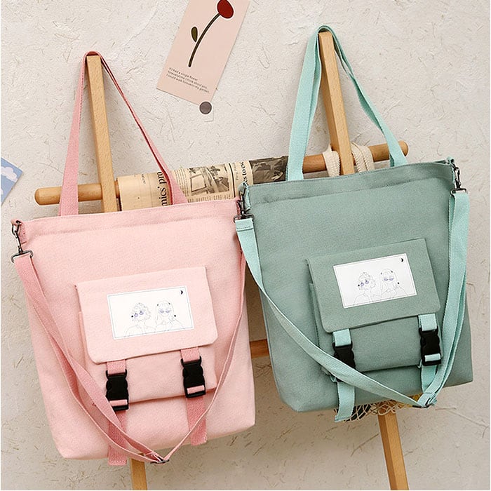 ・シンプルな無地カラーのキャンバス地に、フロントポケットのプリントデザインがポイント。