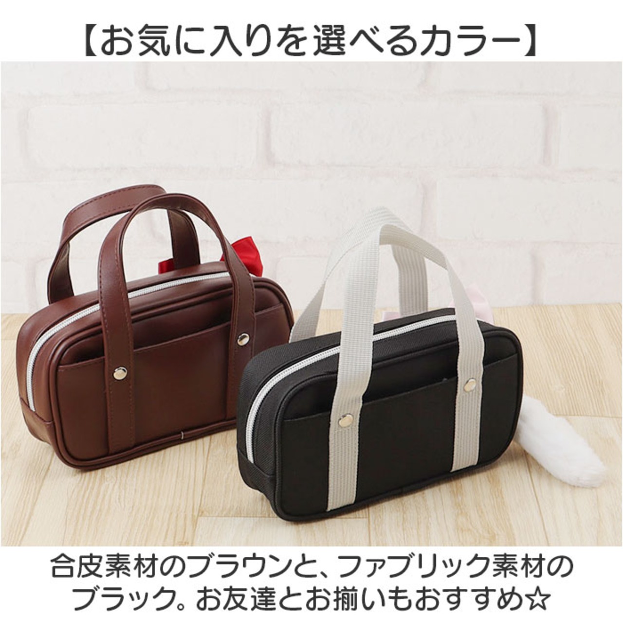 ・合皮素材のブラウンと、ファブリック素材のブラック。お友達とお揃いもおすすめ☆