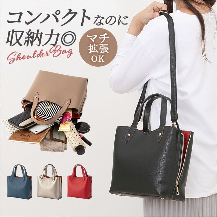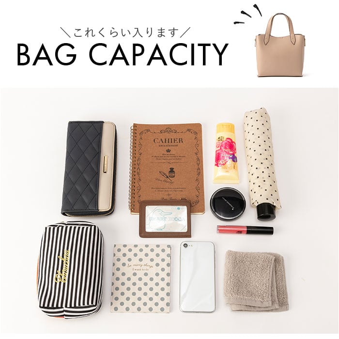 ・マチ幅を広く設けポーチや飲料ボトルなどかさばる小物もすっきり入る◎
