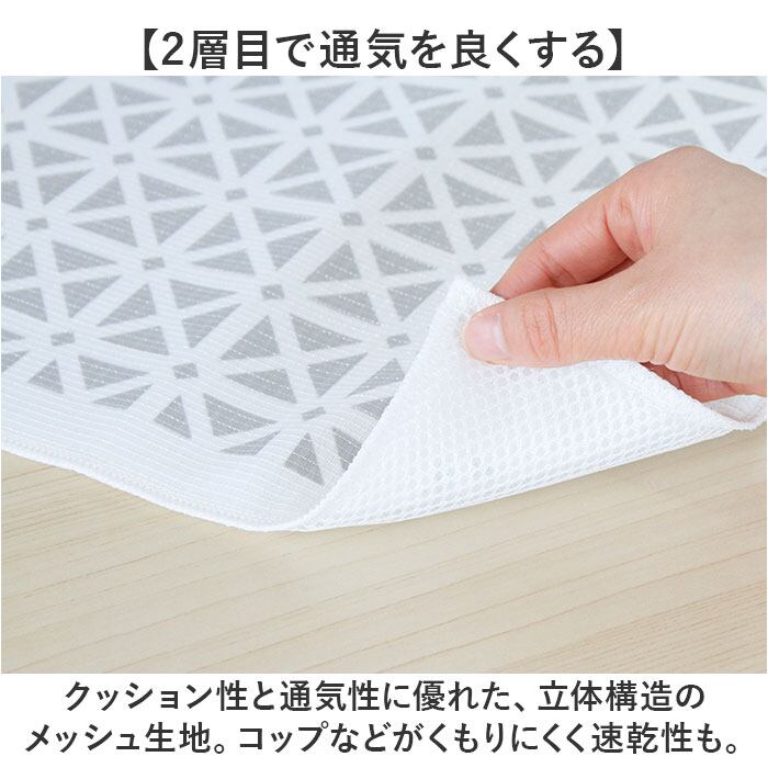 ・クッション性と通気性に優れた、立体構造のメッシュ生地。コップなどがくもりにくく速乾性も。