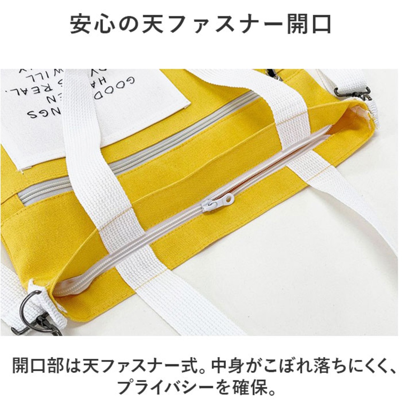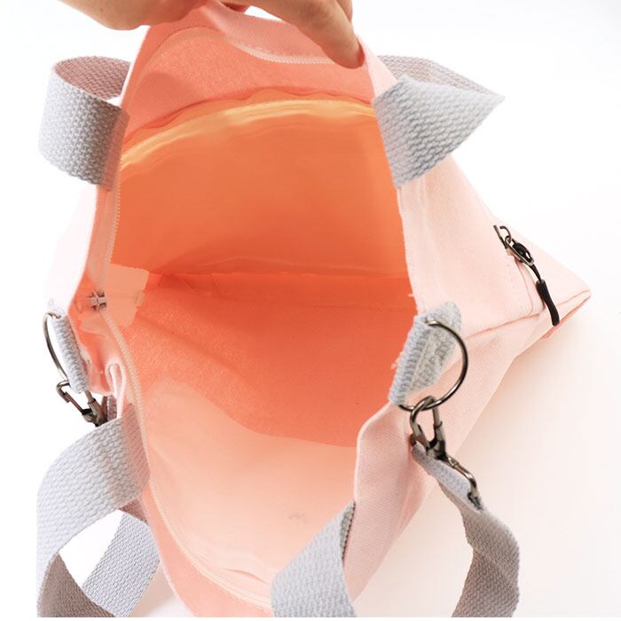 ・開口部は天ファスナー式。中身がこぼれ落ちにくく、プライバシーを確保。