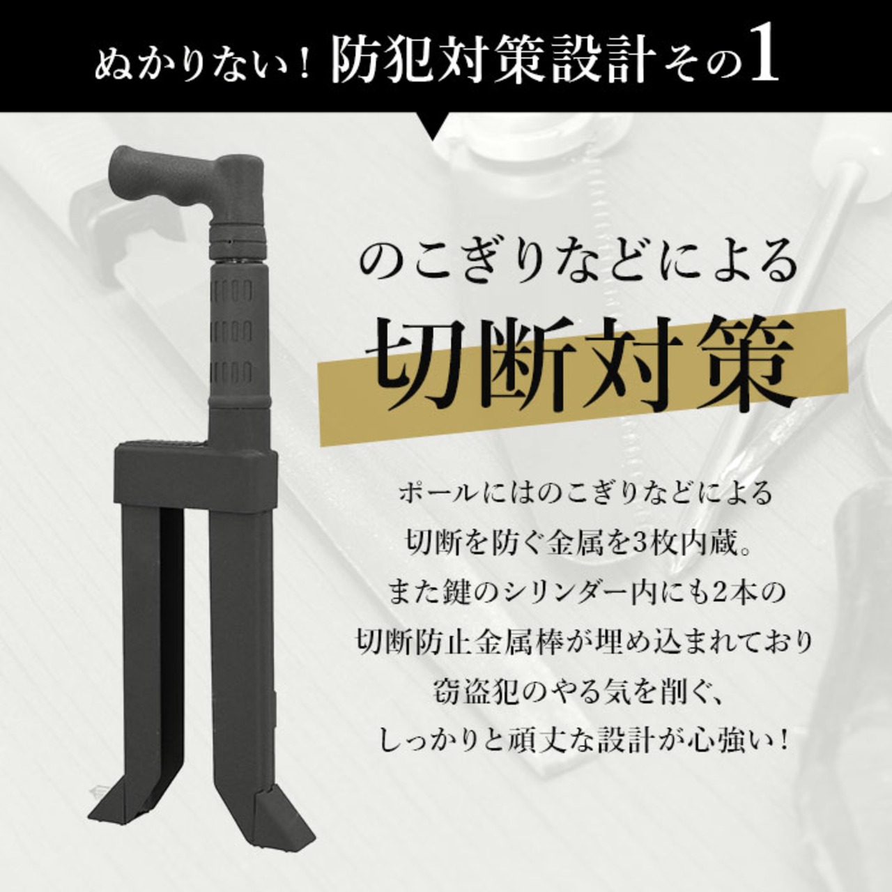 ・のこぎりによる切断を防いでくれる金属を内蔵し、盗難に強い仕様。