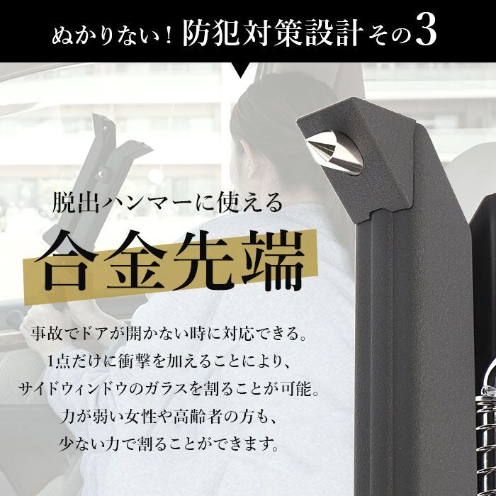 ・事故や水没でドアが開かない時も対応できる合金先端付き。