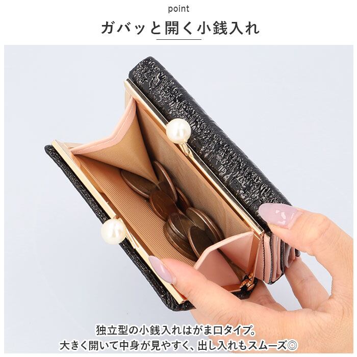 ・独立型の小銭入れはがま口タイプ。大きく開いて中身が見やすく、出し入れもスムーズ◎