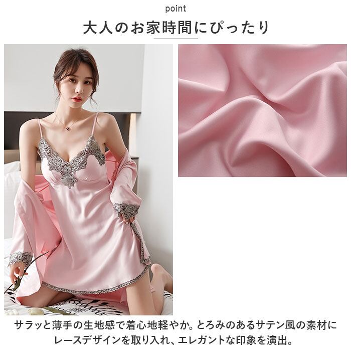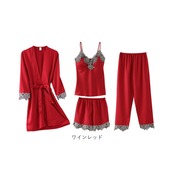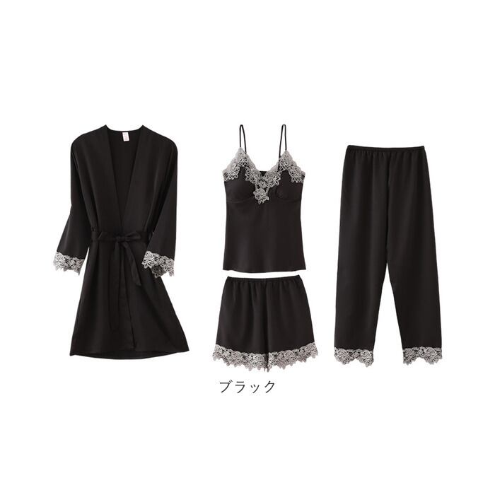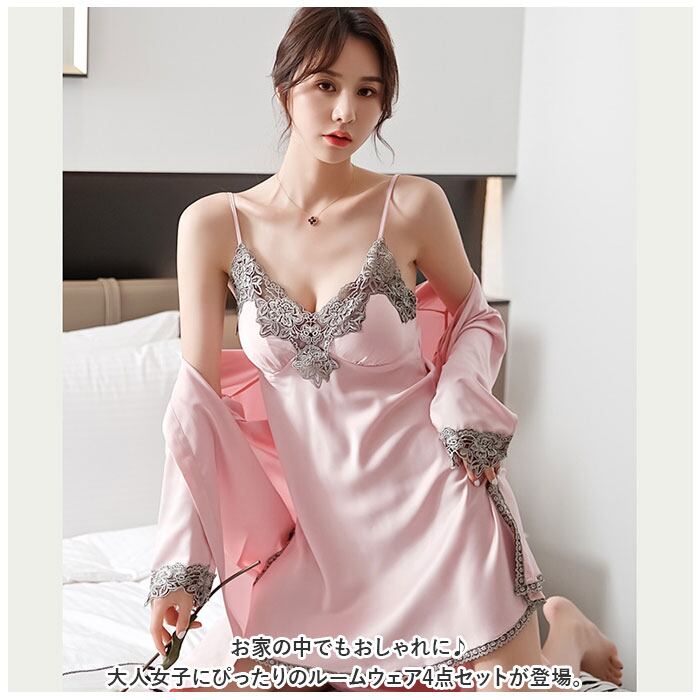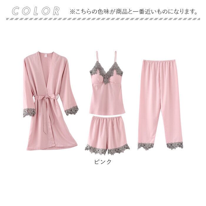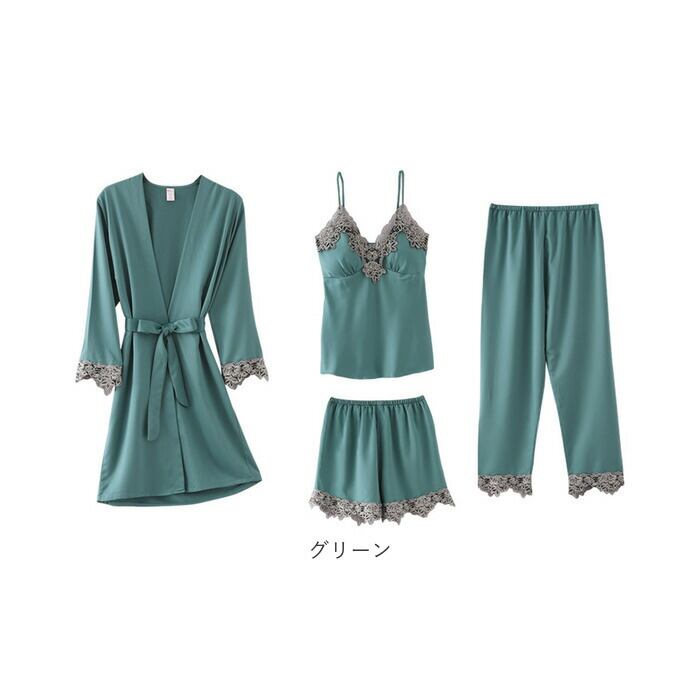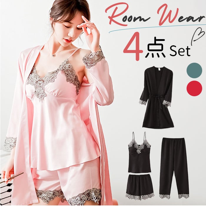 ルームウェア レディース 通販 パジャマ 部屋着 寝間着 ナイトウェア 4点セット セット 半ズボン 長ズボン キャミソール カップ付き 羽織 ガウン シンプル 無地 レース サテン 春 夏 秋 薄手 軽い 旅行 お泊り 上下 セットアップ かわいい おしゃれ