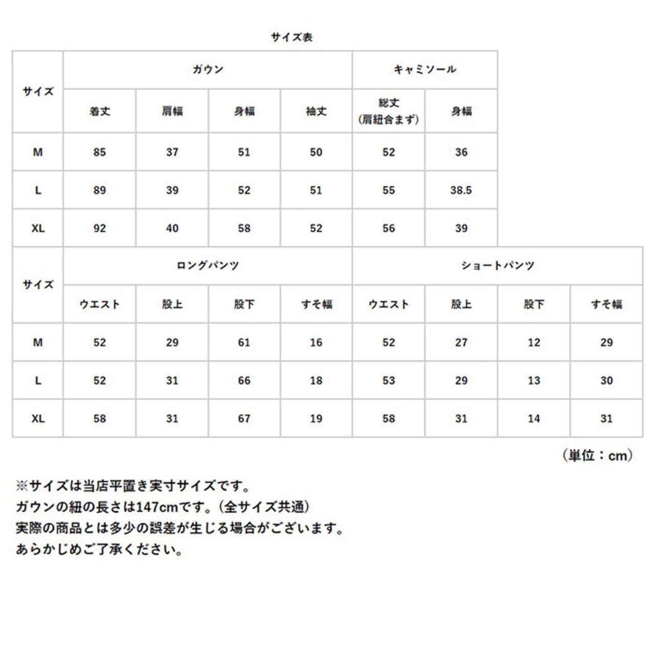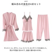 ・キャミソール、ガウン、ショートパンツ、ロングパンツの4点セット。気分や気温に合わせて、自由に組み合わせOK。
