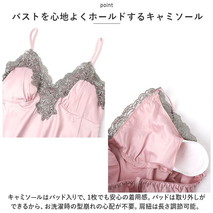 ・キャミソールはパッド入りで、1枚でも安心の着用感。パッドは取り外しができるから、お洗濯時の型崩れの心配が不要。肩紐は長さ調節可能。