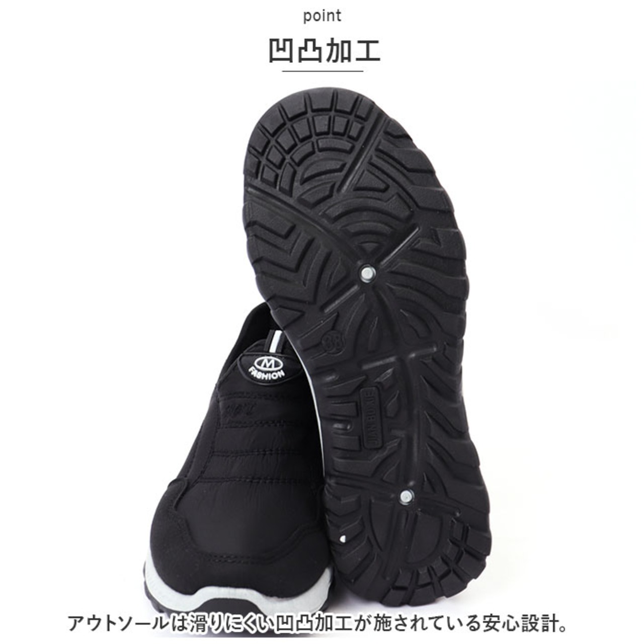 ・アウトソールは滑りにくい凹凸加工が施されている安心設計。