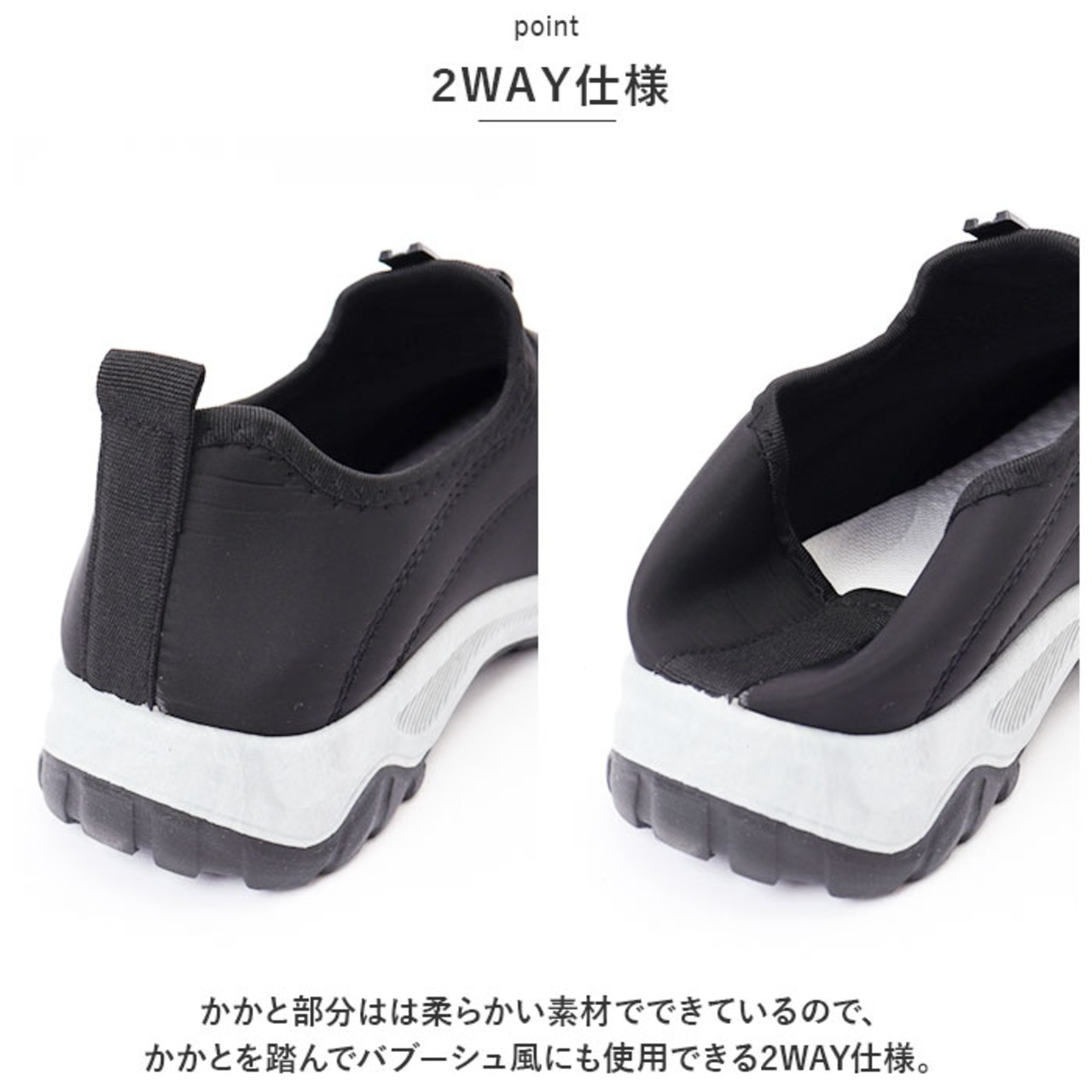 ・かかと部分はは柔らかい素材でできているので、かかとを踏んでバブーシュ風にも使用できる2WAY仕様。
