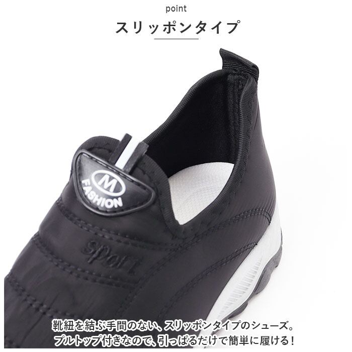 ・靴紐を結ぶ手間のない、スリッポンタイプのシューズ。プルトップ付きなので、引っぱるだけで簡単に履ける!