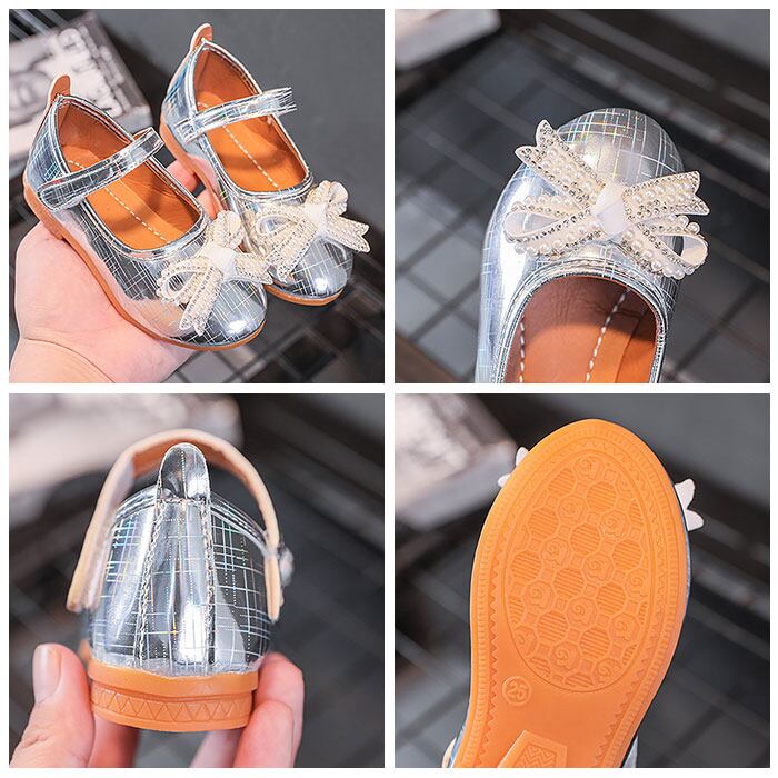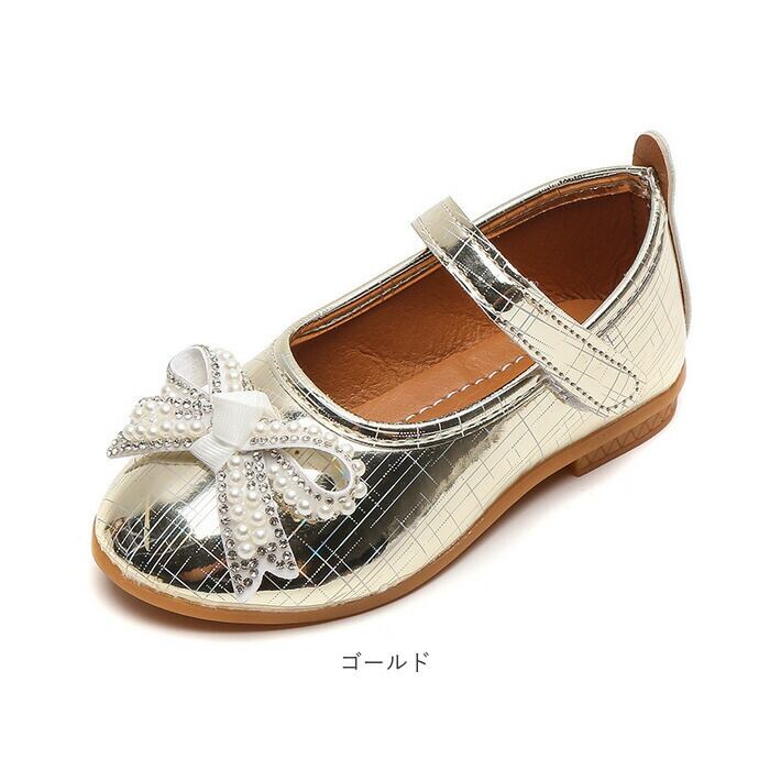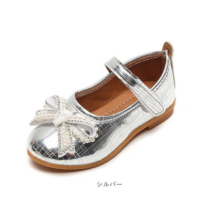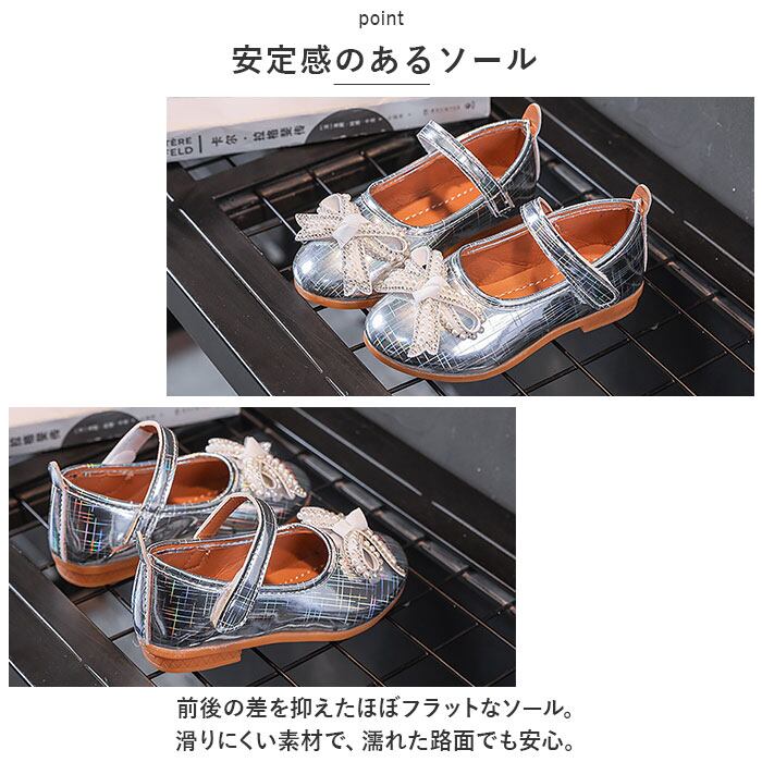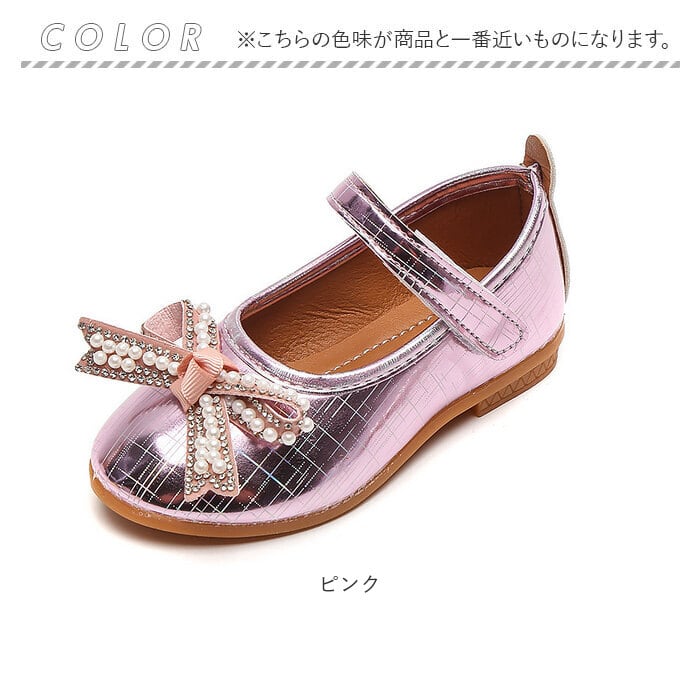 ・上品な光沢のある仕上がり。つま先部分に配置された立体的なリボンには、キラッと光るストーンやイミテーションパールをプラス。