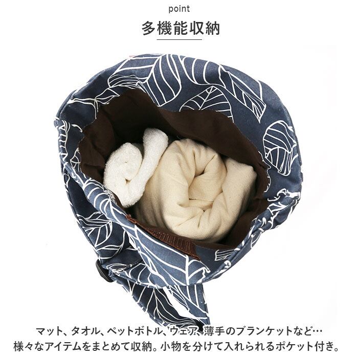 ・マット、タオル、ペットボトル、ウェア、薄手のブランケットなど…様々なアイテムをまとめて収納。小物を分けて入れられるポケット付き。