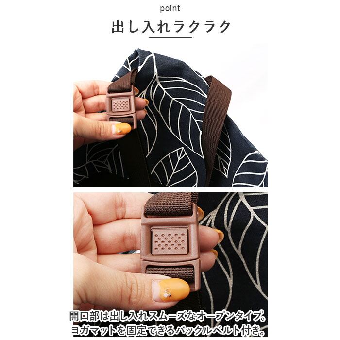・開口部は出し入れスムーズなオープンタイプ。ヨガマットを固定できるバックルベルト付き。