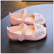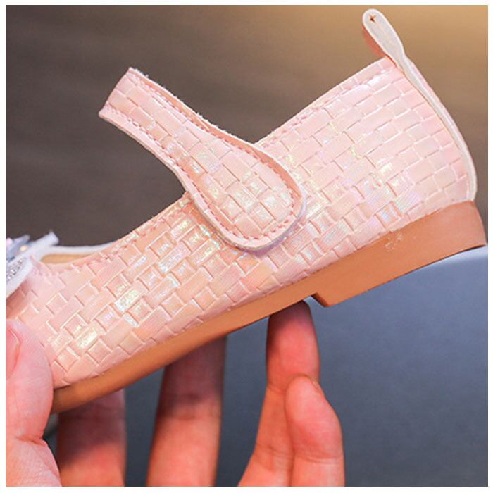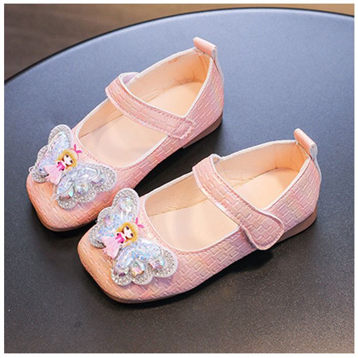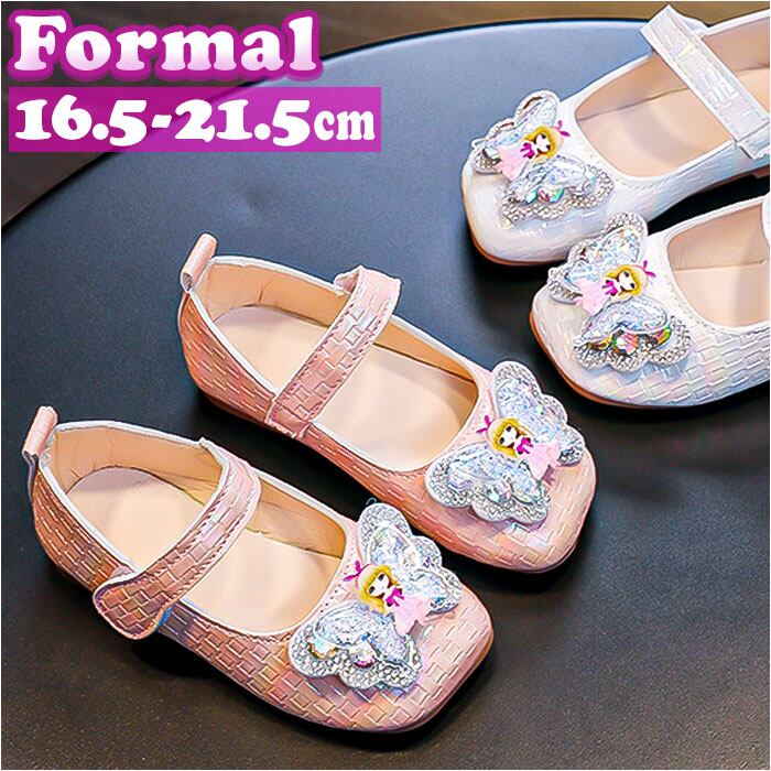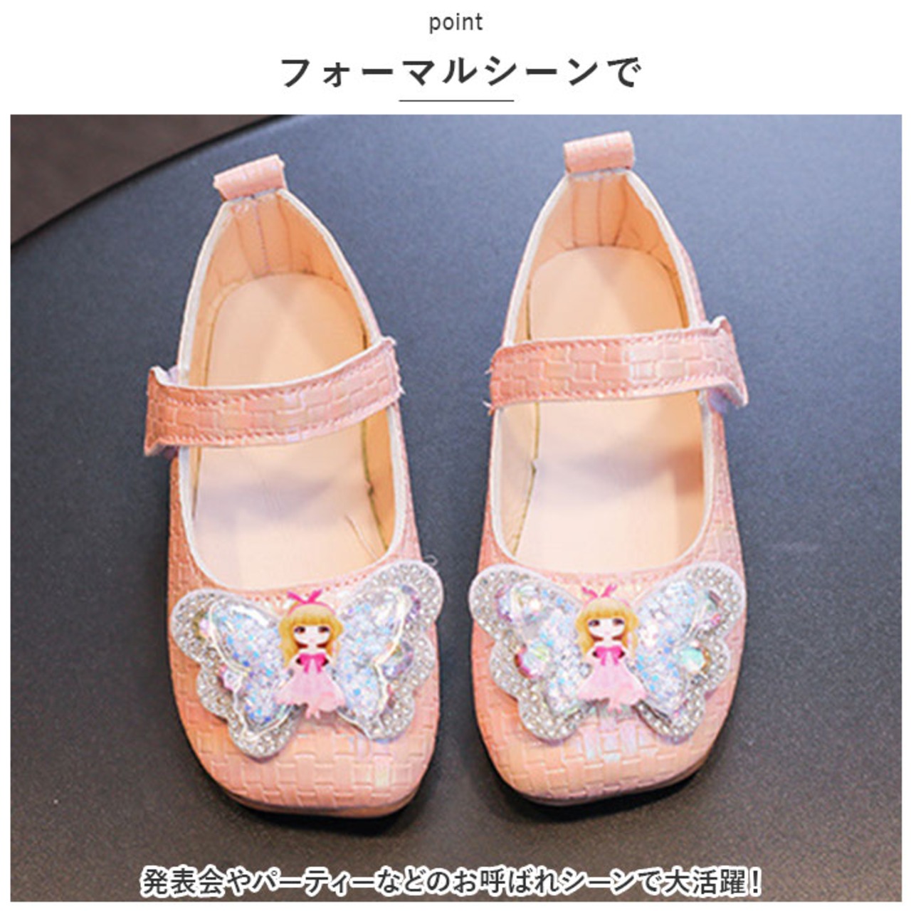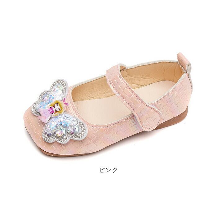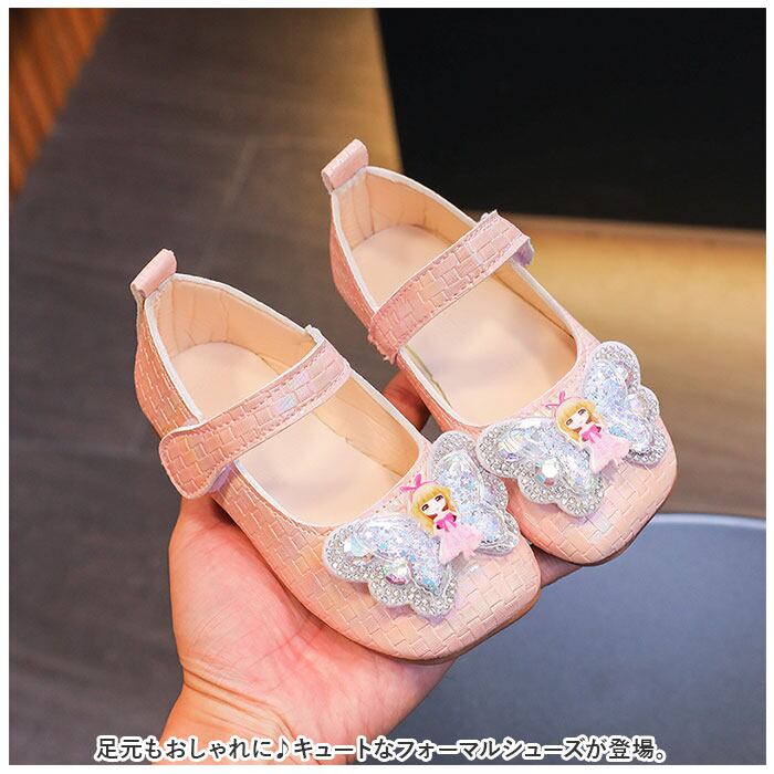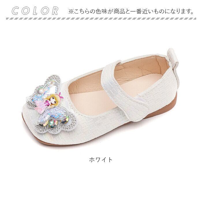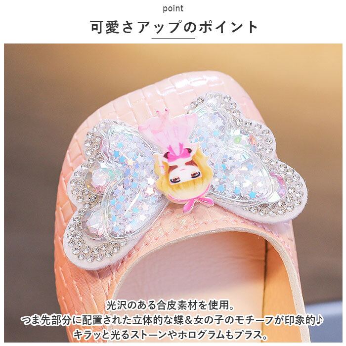 ・光沢のある合皮素材を使用。つま先部分に配置された立体的な蝶&女の子のモチーフが印象的♪キラッと光るストーンやホログラムもプラス。